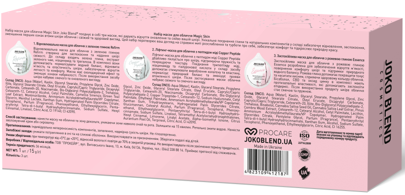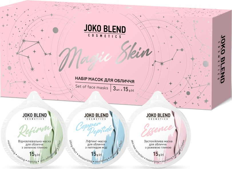 Набір масок для обличчя Magic Skin Jk Blend ® поєднує в собі три маски, які дарують відчуття оновлення та сяйво вашій шкірі. Унікальне поєднання глини та натуральних компонентів у складі забезпечує відновлення, заспокоєння, зменшення перших ознак втоми шкіри обличчя і свіжий та здоровий вигляд. Поки навколо панує новорічна магія, ваш догляд перетворюється на справжні миті розслаблення та турботи про себе. Цей набір забезпечить комфорт та підкреслить природну красу.