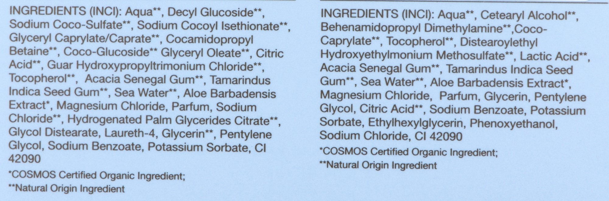 Морський біо-філер гідра колаген шампунь Aqua**, Decyl Glucoside**, Sodium Coco-Sulfate**, Sodium Cocoyl Isethionate**, Glyceryl Caprylate/Caprate**, Cocamidopropyl Betaine**, Coco-Glucoside** Glyceryl Oleate**, Citric Acid**, Guar Hydroxypropyltrimonium Chloride**, Tocopherol**, Acacia Senegal Gum**, Тамариндус Indica Seed Gum**, морська вода**, екстракт алое барбаденського*, хлорид магнію, парфуми, хлорид натрію**, гідрогенізований цитрат гліцеридів пальми**, гліколь дистеарат, лаурет-4, гліцерин**, пентиленгліколь, бензоат натрію, сорбат калію, CI 42090
