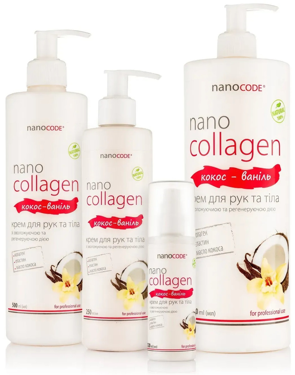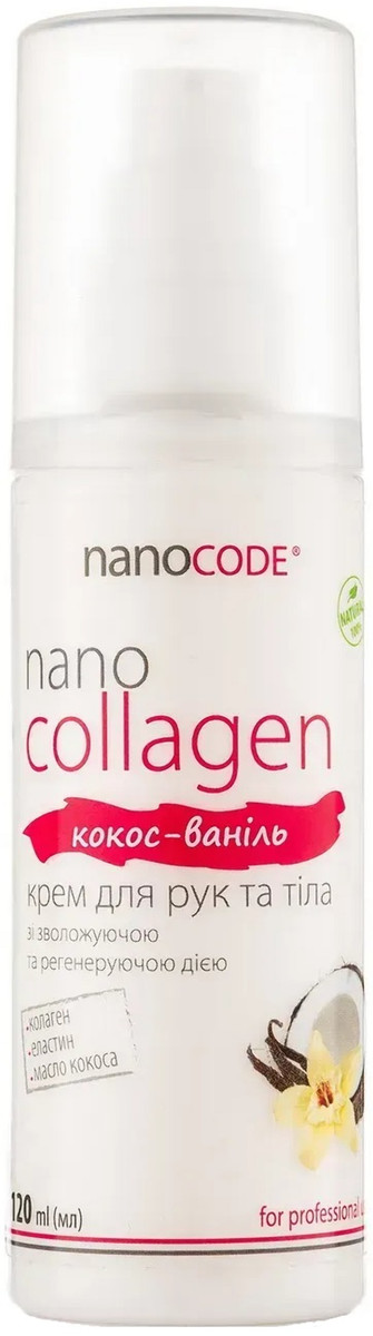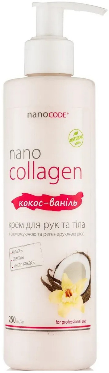 Крем з колагеном для рук і тіла КОКОС - ВАНІЛЬ, NANOCODE, має чудову ніжну текстуру, яка чинить швидку зволожуючу і живильну дію на шкіру. Колаген та еластин, що входять до складу крему, підтягують, надають тонус, зволожують і сприяють регенерації епідермісу. Натуральне масло кокоса володіє прекрасними поживними, пом'якшуючими і зволожуючими властивостями.