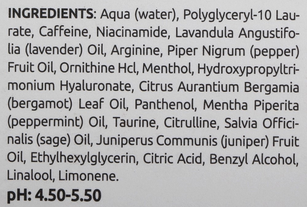 Aqua(water), Polyglyceryl-10 Laurate, Caffeine, Niacinamide, Lavandula Angustifolia(lavender)oil, Arginine, PiperNigrum(pepper) Fruit oil, Ornithine Hcl, Menthol, Hydroxypropyltrimonium Hyaluronate, Citrus Aurantium Bergamia (bergamot) leaf oil, Panthenol, Mentha Piperita (peppermint) oil, Taurine, Citrulline, Salvia Officinalis (sage)oil, Juniperus Communis (juniper) fruit oil, Ethylhexylglycerin, Citric Acid, Benzyl