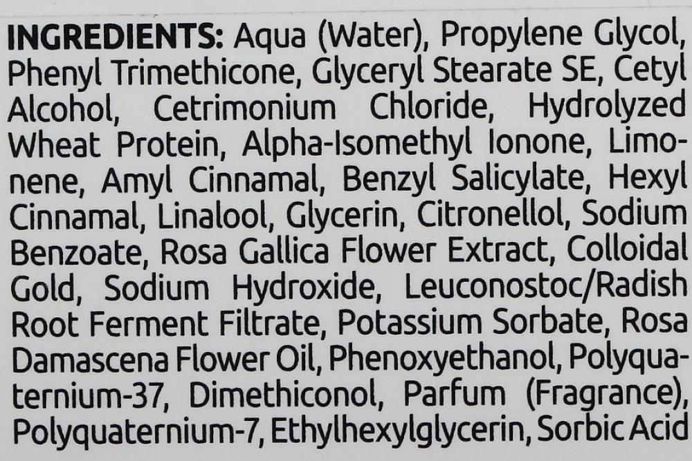 Склад: Aqua (Water), Propylene Glycol, Phenyl Trimethicone, Glyceryl Stearate SE, Cetyl Alcohol, Cetrimonium Chloride, Hydrolyzed Wheat Protein, Alpha-Isomethyl Ionone, Limonene, Amyl Cinnamal, Benzyl Salicylate, Hexyl Cinnamal, Linalool, Glycerin, Citronellol, Sodium Benzoate, Rosa Gallica Flower Extract, Colloidal Gold, Sodium Hydroxide, Leuconostoc/Radish Root Ferment Filtrate, Potassium Sorbate, Rosa Damascena Flower Oil, Phenoxyethanol, Polyquaternium-37, Dimethiconol, Parfum (Fragrance), Polyquaternium-7, Ethylhexylglycerin, Sorbic Acid