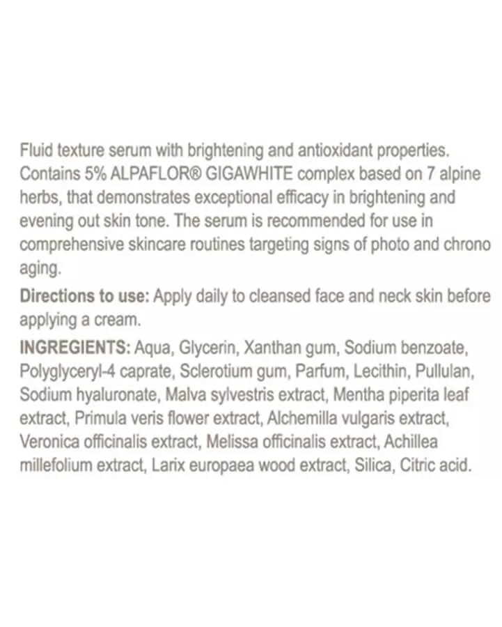 Антиоксидантна сироватка на основі біотехнологічного рослинного комплексу з 7 альпійських трав ALPAFLOR® GIGAWHITE. Синергія ретельно відібраних рослинних екстрактів надала їхню максимальну активність для освітлення тону шкіри, корекції гіперпігментації та захисту шкіри від пошкодження вільними радикалами. Завдяки поєднанню фітокомплексу з гіалуроновою кислотою та лецитином сироватка впливає на всі ланки процесів фотостаріння, миттєво заповнює зморшки та пролонговано зволожує шкіру, що сприяє відновленню гомеостазу в епідермісі й в міжклітинному просторі дерми. Вміщує рекордну кількість флавоноїдів та фітостеринів, які чинять пом’якшуючий та стимулюючий ефект на шкіру, сприяють утриманню вологи та загоєнню епідермісу. Сироватка має протизапальні та протинабрякові властивості, покращує мікроциркуляцію та зміцнює судинну стінку.