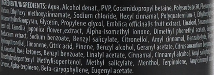 Склад: Aqua, Alcohol denat., PVP, Cocamidopropyl betaine, Polysorbate 20, Phenoxyethanol, Parfum, Bis-ethylhexyloxyphenol methoxyphenyl triazine, Sodium chloride, Hexyl cinnamal, Polyquaternium-7, Ethylhexylglycerin, Hexamethylindanopyran, Glycerin, Propylene glycol, Emblica officinalis fruit extract, Linalool, Sesamum indicum seed oil, Alpha-isomethyl ionone, Camellia sinensis leaf extract, Dimethyl phenethyl acetate, Gossypium herbaceum extract, Sodium benzoate, Benzyl salicylate, Citronellol, Amyl cinnamal, Benzaldehyde, Terpineol, Hydroxycitronellal, Citric acid.