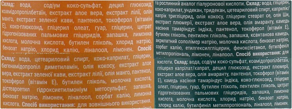 - на основі масел кокоса і манго, екстрактів алое вера, лілії та зеленої кави;