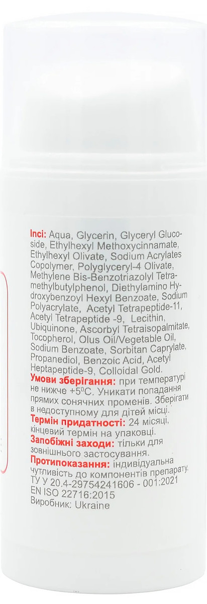 Inci: Aqua, Glycerin, Glyceryl Glucoside, Ethylhexyl Methoxycinnamate, Ethylhexyl Olivate, Sodium Acrylates Copolymer, Polyglyceryl-4 Olivate, Methylene Bis-Benzotriazolyl Tetramethylbutylphenol, Diethylamino Hydroxybenzoyl Hexyl Benzoate, Sodium Polyacrylate, Acetyl Tetrapeptide-11, Acetyl Tetrapeptide -9, Lecithin, Ubiquinone, Ascorbyl Tetraisopalmitate, Tocopherol, Olus Oil/Vegetable Oil, Sodium Benzoate, Sorbitan Caprylate, Propanediol, Benzoic Acid, Acetyl Heptapeptide-9, Colloidal Gold.