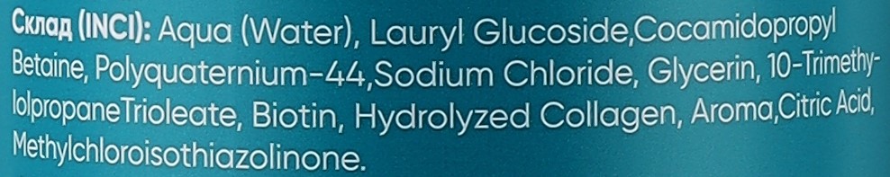 Склад: Aqua (Water), Lauryl Glucoside, Cocamidopropyl Betaine, Polyquaternium-44, Sodium Chloride, Glycerin, 10-Trimethylolpropane Trioleate, Biotin, Hydrolyzed Collagen, Aroma, Citric Acid, Methylchloroisothiazolinone.