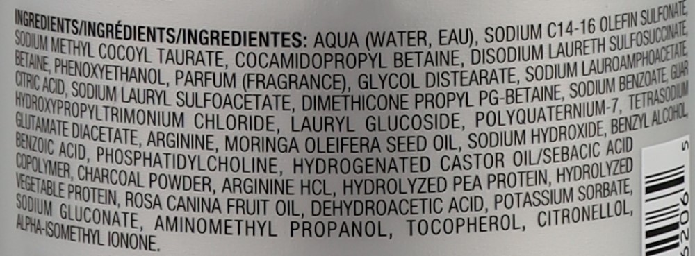 Склад: Aqua (Water, Eau), Sodium C14-16 Olefin Sulfonate, Sodium Methyl Cocoyl Taurate, Cocamidopropyl Betaine, Disodium Laureth Sulfosuccinate, Betaine, Phenoxyethanol, Parfum (Fragrance), Glycol Distearate, Sodium Lauroamphoacetate, Citric Acid, Sodium Lauryl Sulfoacetate, Dimethicone Propyl PG-Betaine, Sodium Benzoate, Guar Hydroxypropyltrimonium Chloride, Lauryl Glucoside, Polyquaternium-7, Tetrasodium Glutamate Diacetate, Arginine, Moringa Oleifera Seed Oil, Sodium Hydroxide, Benzyl Alcohol, Benzoic Acid, Phosphatidylcholine, Hydrogenated Castor Oil/Sebacic Acid Copolymer, Charcoal Powder, Arginine HCl, Hydrolyzed Pea Protein, Hydrolyzed Vegetable Protein, Rosa Canina Fruit Oil, Dehydroacetic Acid, Potassium Sorbate, Sodium Gluconate, Aminomethyl Propanol, Tocopherol, Citronellol, Alpha-Isomethyl Ionone.