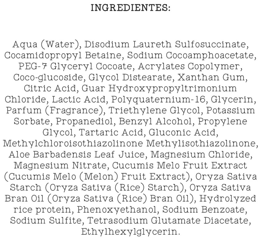 Склад: Aqua (Water), Disodium Laureth Sulfosuccinate, Cocamidopropyl Betaine, Sodium Cocoamphoacetate, PEG-7 Glyceryl Cocoate, Acrylates Copolymer, Coco-glucoside, Glycol Distearate Xanthan Gum, Citric Acid, Guar Hydroxypropyltrimonium Chloride, Lactic Acid, Polyquaternium-16, Glycerin, Parfum (Fragrance), Triethylene Glycol, Potassium Sorbate, Propanediol, Benzyl Alcon Propylene Glycol, Tartaric Acid, Gluconic Acid, Methylchloroisothiazolinone & Methylisothiazolinone, Aloe Barbadensis Leaf Juice, Magnesium Chloride, Magnesium Nitrate, Cucumis Melo Fruit Extract (Cucumis Mel (Melon) Fruit Extract), Oryza Sativa Starch (Oryza Sativa (Rice) Starch), Oryza Sativa Bran Oill (Oryza Sativa (Rice) Bran Oil), Hydrolyzed rice protein, Phenoxyethanol, Sodium Benzoate, Sodium Sulfite, Tetrasodium Glutamate Diacetate, Ethylhexylglycerin.