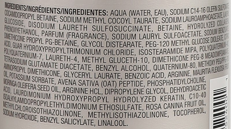 Склад: Aqua (Water, Eau), Sodium C14-16 Olefin Sulfonate, Cocamidopropyl Betaine, Sodium Methyl Cocoyl Taurate, Sodium Lauroamphoacetate, Lauryl Glucoside, Disodium Laureth Sulfosuccinate, Betaine, Hydrolyzed Collagen, Phenoxyethanol, Parfum (Fragrance), Sodium Lauryl Sulfoacetate, Sodium Benzoate, Dimethicone Propyl PG-Betaine, Glycol Distearate, PEG-120 Methyl Glucose Dioleate, Citric Acid, Guar Hydroxypropyltrimonium Chloride, Isostearamide MIPA, Polyquaternium-47, Polyquaternium-7, Laureth-4, Methyl Gluceth-10, Dimethicone PEG-8 Meadowfoamate, Tetrasodium Glutamate Diacetate, Benzyl Alcohol, Quaternium-80, Methoxy PEG/PPG-7/3 Aminopropyl Dimethicone, Glyceryl Laurate, Benzoic Acid, Arginine, Mauritia Flexuosa Fruit Oil, Potassium Sorbate, Avena Sativa (Oat) Peptide, Phosphatidylcholine, Moringa Oleifera Seed Oil, Arginine HCl, Dipropylene Glycol, Dehydroacetic Acid, Laurdimonium Hydroxypropyl Hydrolyzed Keratin, C10-40 Isoalkylamidopropylethyldimonium Ethosulfate, Rosa Canina Fruit Oil, Methylchloroisothiazolinone, Methylisothiazolinone, Tocopherol, Sodium Hydroxide, Benzyl Salicylate, Linalool.
