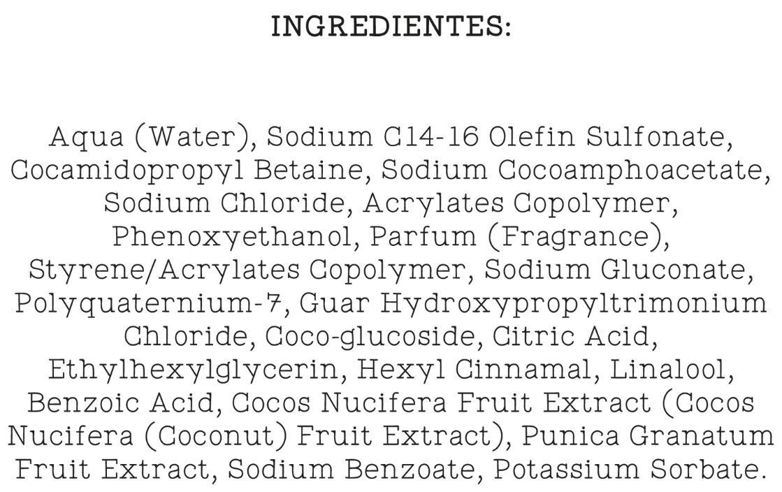 Склад: Aqua (Water), Sodium C14-16 Olefin Sulfonate, Cocamidopropyl Betaine, Sodium Cocoamphoacetate, Sodium Chloride, Acrylates Copolymer, Phenoxyethanol, Parfum (Fragrance), Styrene/Acrylates Copolymer, Sodium Gluconate, Polyquaternium-7, Guar Hydroxypropyltrimonium Chloride, Coco-glucoside, Citric Acid, Ethylhexylglycerin, Hexyl Cinnamal, Linalool, Benzoic Acid, Cocos Nucifera Fruit Extract (Cocos Nucifera (Coconut) Fruit Extract), Punica Granatum Fruit Extract, Sodium Benzoate, Potassium Sorbate.