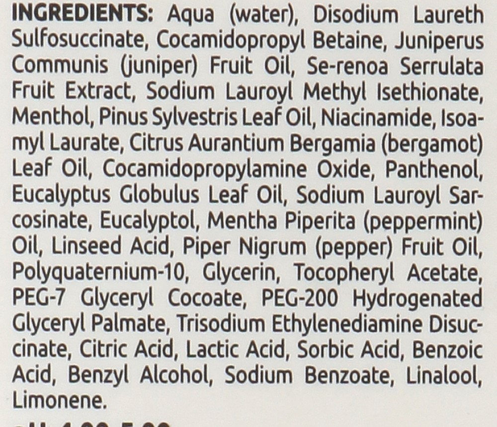 Aqua (water), disodium Laureth Sulfosuccinate, Cocamidopropyl Betaine, Juniperus Communis( juniper) Fruit oil, Serenoa Serrulata ruit Extract, Sodium Lauroul Methyl Isethionate, Menthol, Pinus Sylvestris Leaf oil, Niacinamide, Isoamyl Laurate, Citrus Aurantium Bergamia Leaf Oil, Cocamidopropylamine Oxide, Panthenol, Eucalyptus Globulus Leaf oil, Sodium Lauroyl Sarcosinate, Eucalyptol, Mentha Piperita oil, Linseed Acid, Piper Nigrum (pepper) Fruit Oil, Polyquaternium-10, Glycerin, Tocopheryl Acetate, PEG-7 Glyceryl Cocoate, PEG-200 Hydrogenated Glyceryl Palmate, Trisodium Ethylenediamine Disuccinate, Citric Acid, Lactic Acid, Sorbit Acid, Benzoic Acid, Benzyl Alcohol, Sodium Benzoate, Linalool, Limonene.