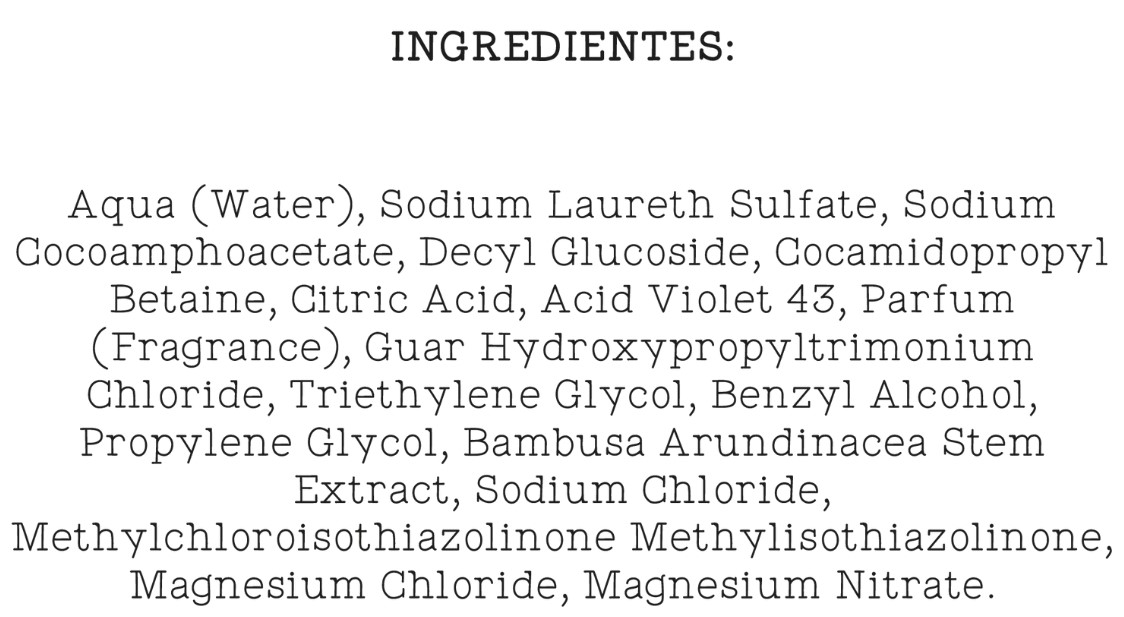 Склад: Aqua (water), sodium laureth sulfate, sodium cocoamphoacetate, decyl glucoside, cocamidopropyl betaine, citric acid, acid violet 43, parfum (fragrance), guar hydroxypropyltrimonium chloride, triethylene glycol, benzyl alcohol, propylene glycol, bambusa arundinacea stem extract, sodium chloride , methylchloroisothiazolinone methylisothiazolinone, magnesium chloride, magnesium nitrate.