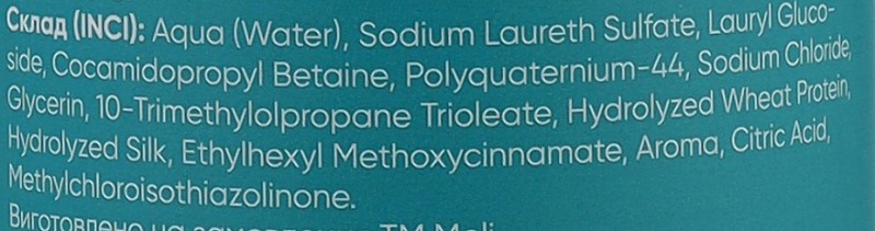Склад: Aqua (Water), Sodium Laureth Sulfate, Lauryl Glucoside, Cocamidopropyl Betaine, Polyquaternium-44, Sodium Chloride, Glycerin, 10-Trimethylolpropane Trioleate, Hydrolyzed Wheat Protein, Hydrolyzed Silk, Ethylhexyl Methoxycinnamate, Aroma, Citric Acid, Methylchloroisothiazolinone.