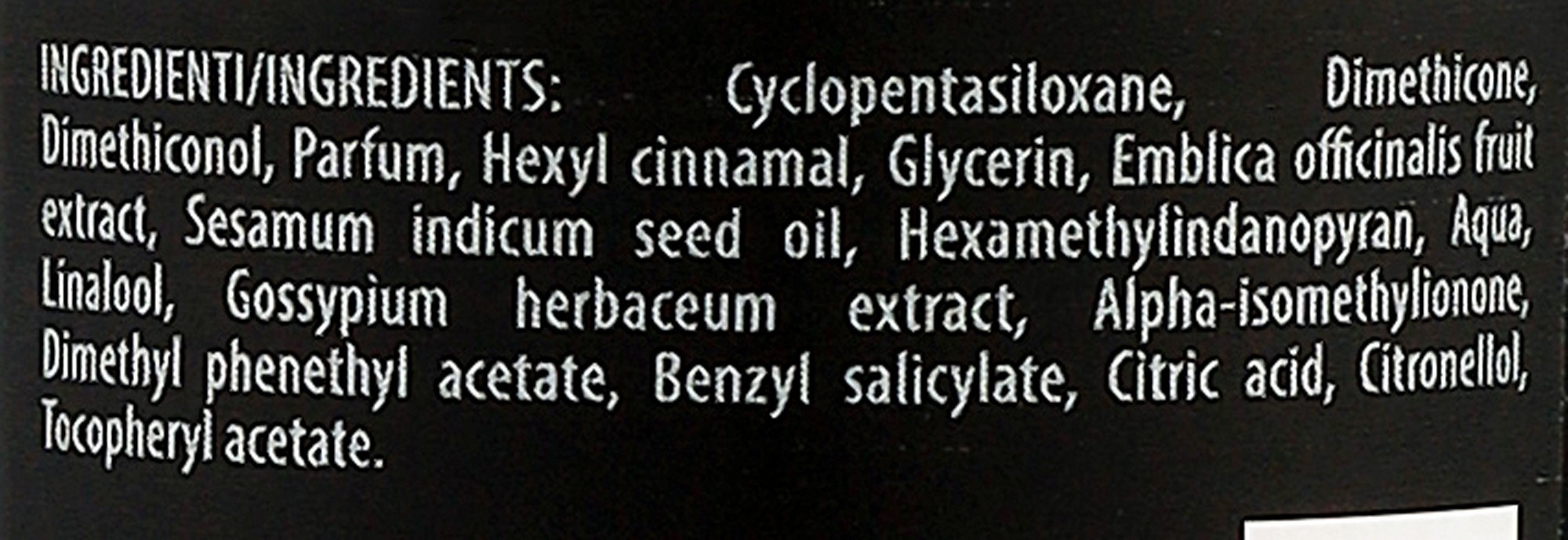Склад: Cyclopentasiloxane, Dimethicone, Dimethiconol, Parfum, Tocopheryl acetate, Hexyl cinnamal, Glycerin, Emblica officinalis fruit extract, Sesamum indicum seed oil, Hexamethylindanopyran, Aqua, Linalool, Gossypium herbaceum extract, Alpha-isomethyl ionone, Dimethyl phenethyl acetate, Benzyl salicylate, Citric acid, Citronellol.