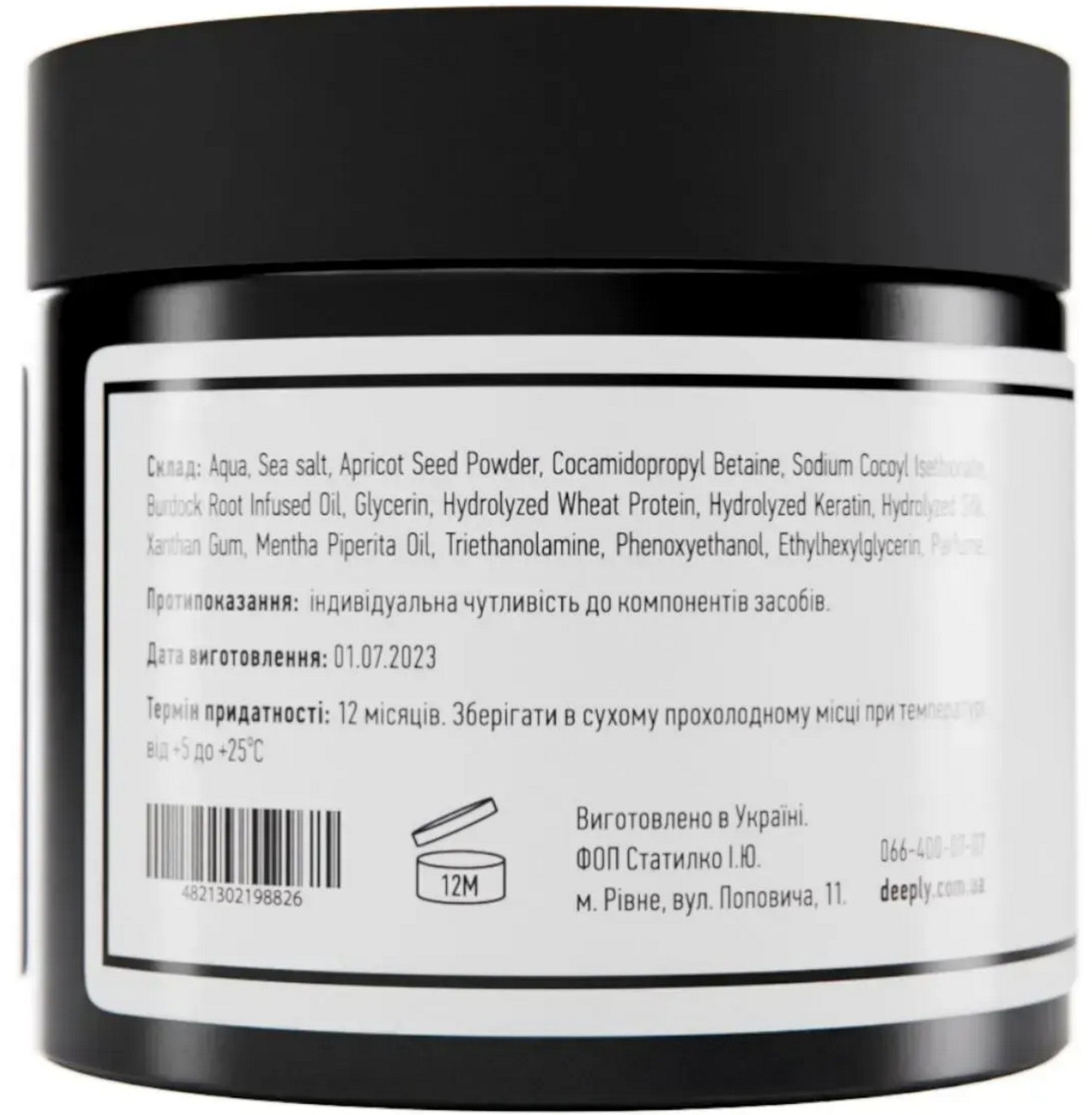Скраб для шкіри голови deeply - це засіб призначений для дбайливого очищення шкіри голови від залишків стайлінгу, силіконів, які містяться в домашньому догляді за волоссям, а також відмерлих часток шкіри та надлишків жиру. Формула, яка містить дрібні частини абрикосової кісточки та морську сіль, ефективно позбавляє шкіру голови від забруднень, сприяє підвищенню кровообігу та прискоренню росту волосся, нормалізує виділення себуму, що підходить для боротьби з надмірною жирністю.