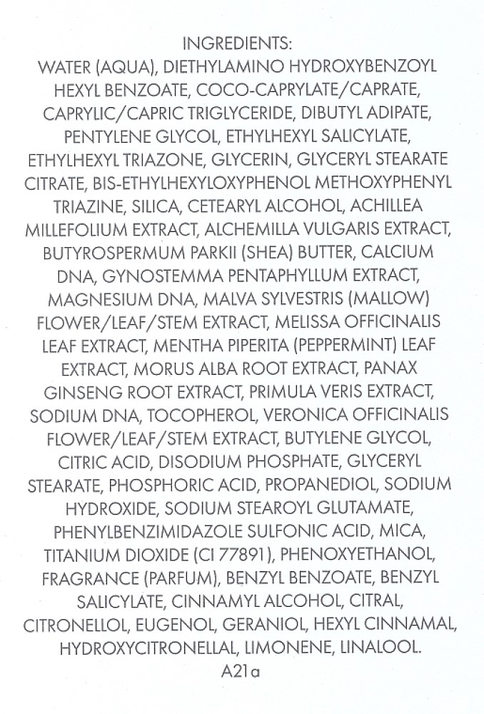 Склад: Water, Diethylamino Hydroxybenzoyl Hexyl Benzoate, Coco-Caprylate/Caprate, Caprylic/Capric Triglyceride, Dibutyl Adipate, Pentylene Glycol, Ethylhexyl Salicylate, Ethylhexyl Triazone, Glycerin, Glyceryl Stearate Citrate, Bis-Ethylhexyloxyphenol Methoxyphenyl Triazine, Silica, Cetearyl Alcohol, Achillea Millefolium Extract, Alchemilla Vulgaris Extract, Butyrospermum Parkii (Shea) Butter, Calcium DNA, Gynostemma Pentaphyllum Extract, Magnesium DNA, Malva Sylvestris (Mallow) Flower/Leaf/Stem Extract, Melissa Officinalis Leaf Extract, Mentha Piperita (Peppermint) Leaf Extract, Morus Alba Root Extract, Panax Ginseng Root Extract, Primula Veris Extract, Sodium DNA, Tocopherol, Veronica Officinalis Flower/Leaf/Stem Extract, Butylene Glycol, Citric Acid, Disodium Phosphate, Glyceryl Stearate, Phosphoric Acid, Propanediol, Sodium Hydroxide, Sodium Stearoyl Glutamate, Phenylbenzimidazole Sulfonic Acid, Mica, Titanium Dioxide (CI 77891), Phenoxyethanol, Fragrance (Parfum), Benzyl Benzoate, Benzyl Salicylate, Cinnamyl Alcohol, Citral, Citronellol, Eugenol, Geraniol, Hexyl Cinnamal, Hydroxycitronellal, Limonene, Linalool