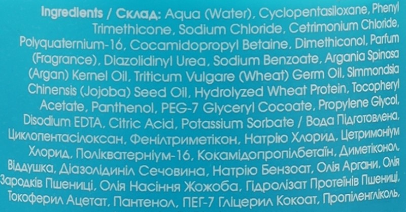 Склад: Aqua (Water), Cyclopentasiloxane, Phenyl Trimethicone, Sodium Chloride, Cetrimonium Chloride, Polyquaternium-16, Cocamidopropyl Betaine, Dimethiconol, Parfum (Fragrance), Diazolidinyl Urea, Sodium Benzoate, Argania Spinosa (Argan) Kernel Oil, Triticum Vulgare (Wheat) Germ Oil, Simmondsia Chinensis (Jojoba) Seed Oil, Hydrolyzed Wheat Protein, Tocopheryl Acetate, Panthenol, PEG-7 Glyceryl Cocoate, Propylene Glycol, Disodium EDTA, Citric Acid, Potassium Sorbate