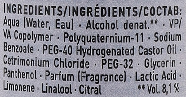 Склад: Aqua (Water), Alcohol denat., VP/VA Copolymer, Polyquaternium-11, Sodium Benzoate, PEG-40 Hydrogenated Castor Oil, Cetrimonium Chloride, PEG-32, Glycerin, Panthenol, Parfum (Fragrance), Lactic Acid, Limonene, Linalool, Citral