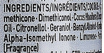 Склад: Cyclo methicone· Dimethiconol· Cocos Nucifera (Coconut) Oil· Citronellol· Geraniol· Benzyl Alcohol· Linalool· Alpha-Isomethyl Ionone · Limonene · Parfum (Fragrance)