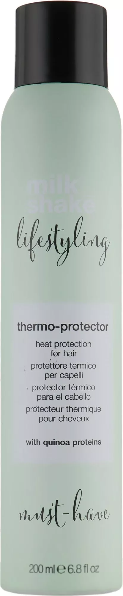 Спрей-термозахист Milk_Shake Lifestyling створює на волоссі невідчутний бар'єр, що захищає його від негативного впливу високих температур стайлерів та ультрафіолетового випромінювання. Завдяки вмісту молочних і шовкових протеїнів засіб заповнює нестачу вологи, надає локонам блиску і шовковистості. Багаті на білки та амінокислоти протеїни кіноа легко вбудовуються в пошкоджені ділянки кутикул, запобігаючи ламкості й посіченості. Вони також «закріплюють» пігмент фарбованого волосся, щоб ви якомога довше могли насолоджуватися своїм новим іміджем.
