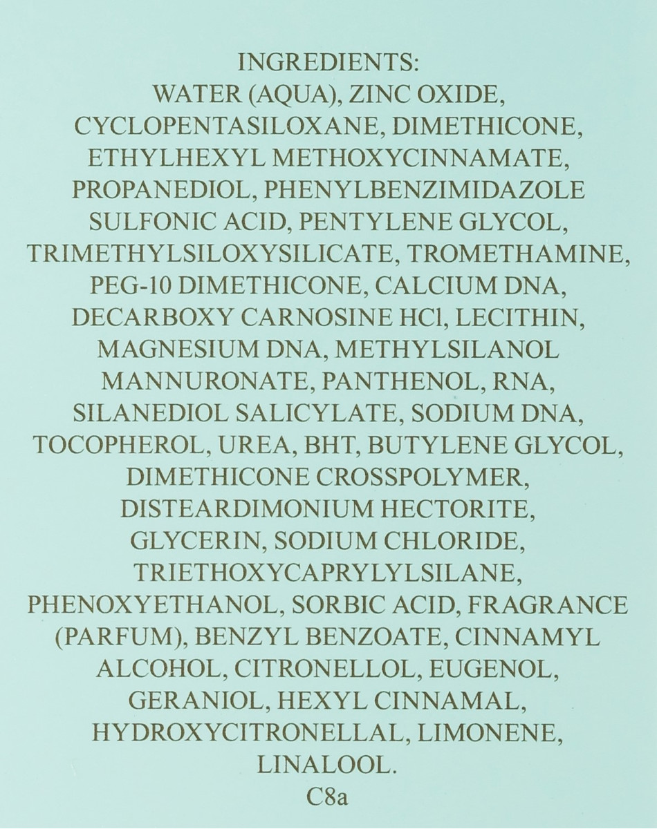 Склад: Water (Aqua), Zinc Oxide, Cyclopentasiloxane, Dimethicone, Ethylhexyl Methoxycinnamate, Propanediol, Phenylbenzimidazole Sulfonic Acid, Pentylene Glycol, Trimethylsiloxysilicate, Tromethamine, PEG-10 Dimethicone, Calcium DNA, Decarboxy Carnosine HCL, Lecithin, Magnesium DNA, Methylsilanol Mannuronate, Panthenol, RNA, Silanediol Salicylate, Sodium DNA, Tocopherol, Urea, BHT, Butylene Glycol, Dimethicone Crosspolymer, Disteardimonium Hectorite, Glycerin, Sodium Chloride, Triethoxycaprylylsilane, Phenoxyethanol, Sorbic Acid, Fragrance (Parfum), Benzyl Benzoate, Cinnamyl Alcohol, Citronellol, Eugenol, Geraniol, Hexyl Cinnamal, Hydroxycitronellal, Limonene, Linalool.