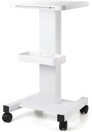 Візок виконаний з металу. Верхня поличка з ручкою для зручного переміщення візка. Є поличка-лоток, призначений для зберігання невеликих маніпул, насадок або косметичних засобів.