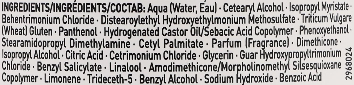 Склад: Aqua (Water, Eau)· Cetearyl Alcohol· Isopropyl Myristate· Behentrimonium Chloride· Distearoylethyl Hydroxyethylmonium Methosulfate· Hydrolyzed Keratin · Steardimonium Hydroxypropyl Hydrolyzed Keratin · Panthenol · Sclerocarya Birrea Seed Oil· Stearamidopropyl Dimethylamine· Cetyl Palmitate· Isopropyl Alcohol· Citric Acid· Guar Hydroxypropyltrimonium Chloride· Sodium Chloride· Glycerin· Sodium Hydroxide · Dimethicone · Phenoxyethanol· Cetrimonium Chloride · Potassium Sorbate · Linalool · Limonene · Benzyl Alcohol · Parfum (Fragrance) · Trideceth-5 · Amodimethicone/Morpholinomethyl Silsesquioxane Copolymer · Methylparaben