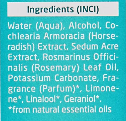 Склад: вода, цетилстеариловий спирт, екстракт хрону, екстракт очітка, масло листя розмарину, карбонат калію, суміш натуральних ефірних их масел, лімонен, ліналоол, гераніол.