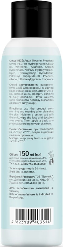 Склад: Aqua, Glycerin, Propylene Glycol, PEG-40 Hydrogenated Castor Oil, Panthenol, Allantoin, Sodium Hyaluronate, NaPCA, Hydrolyzed Collagen, Hydroxypropyl Cyclodextrin, Palmitoyl Tripeptide-38, Phenoxyethanol, Ethylhexylglycerin, Fragrance, CI 42090.