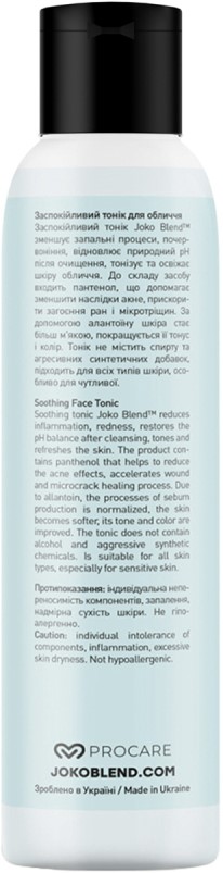Заспокійливий тонік Joko Blend™ зменшує запальні процеси, почервоніння, відновлює природний pH після очищення, тонізує і освіжає шкіру обличчя. Тонік не містить спирту і агресивних синтетичних добавок, підходить для всіх типів шкіри, особливо для чутливої.