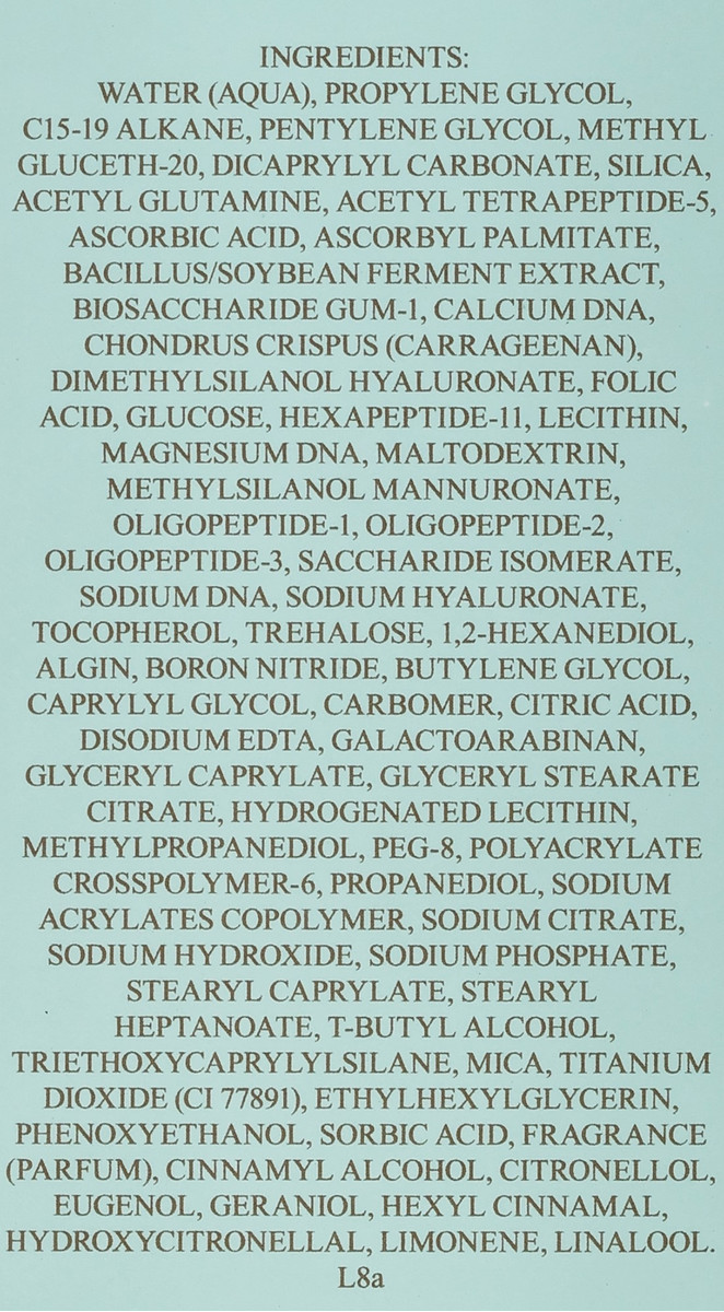 Склад: Water (Aqua), Propylene Glycol, Ci5-19 Alkane, Pentylene Glycol, Methyl Gluceth-20, Dicaprylyl Carbonate, Silica. Acetyl Glutamine, Acetyl Tetrapeptide-3,Ascorbic Acid, Ascorbyl Palmitate, Bacillus/Soybeanferment Extract, Biosaccharidegum-1, Calcium Dna, Chondrus Crispus (Carrageenan), Dimethylsilanol Hyaluronate, Folic Acid, Glucose, Hexapeptide-11,Lecithin Magnesiumdna, Maltodextrin, Methylsilanol Mannuronate, Oligopeptide-1, Oligopeptide-2, Oligopeptide-3, Saccharide Isomerate, Sodium Dna, Ssodium Hyaluronate, Tocopherol, Trehalose, 1,2-Hexanediol,Algin, Boron Nitride, Butylene Glycol, Caprylyl Glycol. Carbomer, Citric Acid, Disodium Edta, Galactoarabinan, Glyceryl Caprylate. Glyceryl Stearate Citrate, Hydrogenated Lecithin, E 1ethylpropanediol, Peg-8, Polyacry La Crosspolymer-6,Propanediol,Sodium Acrylates Copolymer, Sodium Citrate, Sodium Hydroxide, Sodium Phosphate, Stearyl Caprylate, Stearyl Heptanoate, T-Butyl Alcooho, M Riethoxycaprylylsilane, Mica, Titaniom Phenoxyethanol,Sor Bic Acid, Fragran Dioxide (Ci 77891), Ethylhexylglycerin,Fragrance (Parfum), Cinnamyl Alcohol, Citronellol, Eugenol, Geraniol, Hexyl Cinnamal, Hydroxycitronellal. Limonene, Linalool.