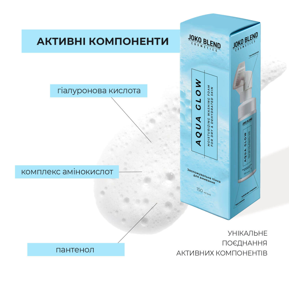 Активні компоненти зволожувальної пінки для вмивання з гіалуроновою кислотою Aqua Glow Joko Blend 150 мл: