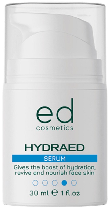 ED Cosmetics Hydraed Serum — зволожувальна сироватка для обличчя є ключовим етапом щоденного догляду, забезпечує шкірі інтенсивне зволоження, антиоксидантний захист та містить регенерувальні компоненти. Завдяки унікальному 7-компонентному зволожувальному комплексу сприяє відновленню необхідного рівня вологи, підвищує еластичність шкіри та прискорює її оновлення. Формула, збагачена гіалуроновою кислотою, ефективно зв'язує воду у шкірі, забезпечуючи тривале зволоження.