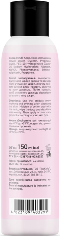 Склад: Aqua, Rosa Damascena Flower Water, Glycerin, Propylene Glycol, PEG-40 Hydrogenated Castor Oil, Sodium Hyaluronate,Allantoin, NaPCA, Phenoxyethanol, Ethylhexylglycerin, Fragrance, CI 16255.