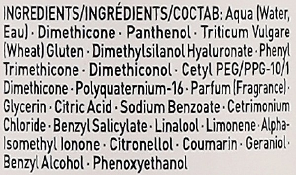 Состав: Aqua (Water, Eau) · Cyclomethicone · Phenyl Trimethicone · Hydrolyzed Keratin · Steardimonium Hydroxypropyl Hydrolyzed Keratin · Panthenol · Simmondsia Chinensis (Jojoba) Seed Oil · Dimethylsilanol Hyaluronate · Citric Acid · Sodium Benzoate · Dimethiconol · Cetrimonium Chloride · Phenoxyethanol · Potassium Sorbate · Polyquaternium-16 · Linalool · Citronellol · AlphaIsomethyl Ionone · Geraniol · Limonene · Parfum (Fragrance) · Cetyl PEG/PPG-10/1 Dimethicone