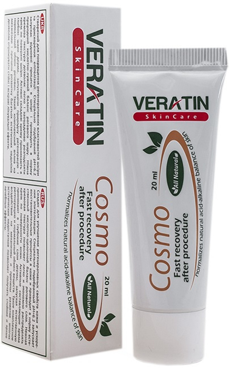 - После пилинга восстанавливает естественный рН кожи. Препятствует образованию воспалительных элементов при лечении акне в постпилинговом уходе. Смыть нейтрализатором пилинговый состав, на подсушенную кожу нанести тонким слоем крем Veratin Cosmo. Для ускоренного восстановления кожи в постпилинговый период необходимо наносить 2 раза в день во время терапии, и в течение 2-3 недель после ее окончания.