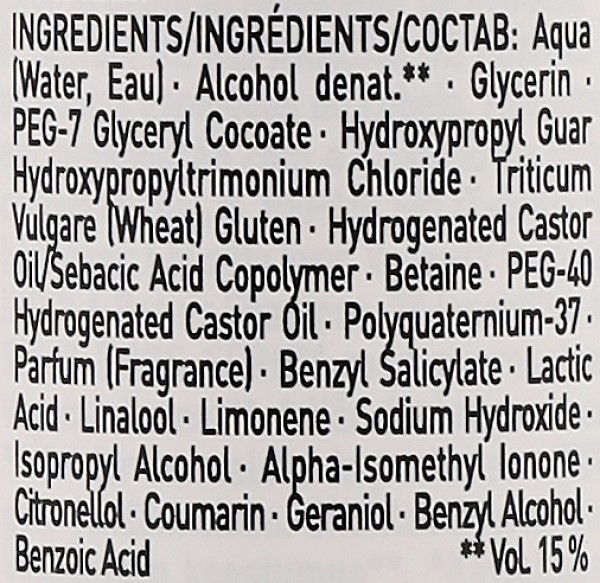 Состав: Aqua (Water, Eau) · Alcohol denat.** · Glycerin · PEG-7 Glyceryl Cocoate · Hydrolyzed Keratin · Sclerocarya Birrea Seed Oil · Betaine · Hydroxypropyl Guar Hydroxypropyltrimonium Chloride· Isopropyl Alcohol · Lactic Acid · Sodium Hydroxide · Phenoxyethanol · Potassium Sorbate · Polyquaternium-37 · Linalool · Limonene · Citronellol· Geraniol· Benzyl Alcohol· AlphaIsomethyl Ionone· Parfum (Fragrance)· PEG- 40 Hydrogenated Castor Oil ** Vol. 17,8 %