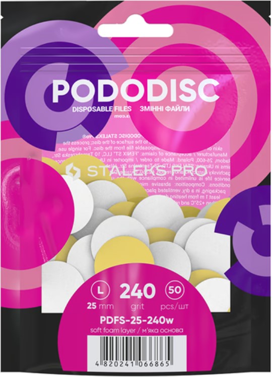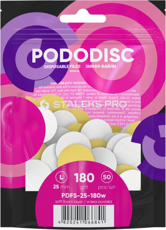Pododisc Staleks Pro — сменные наклейки с абразивом 180 грит и 240 грит, позволяющие педикюрному диску одновременно обработать значительную площадь огрубевшей кожи. Мягкая гритность предназначена для незначительной толщины роговых наслоений. Накладки надежно крепятся и легко снимаются, не размокают в воде и обеспечивают качественную, равномерную очистку от ороговевшего эпидермиса.