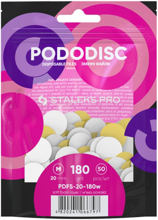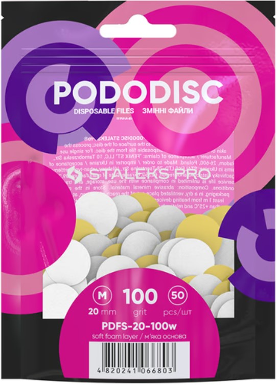 Staleks Pro PodoDisc M – самоклеящиеся накладки с абразивным полотном. Крепятся на педикюрный диск индивидуально для каждого клиента, а после работы утилизируются. Нестандартное полотно с большой насечкой предназначено для локальной обработки очень грубых наслоений омертвевшей кожи.