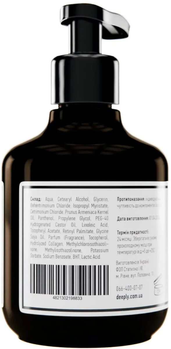 Увлажняющий кондиционер deeply - это универсальное средство, которое предотвращает ломкость, истончение, придает блеск и увлажняет пряди по всей длине. Пропиленгликоль, глицерин, пантенол, масло абрикосовые косточки увлажняют и удерживают влагу в структуре прядей. Формула, обогащенная большим количеством натуральных масел, придает волосам блеск, укрепляет их и насыщает изнутри. Витамин E придает волосам мягкость и предупреждает их ломкость.